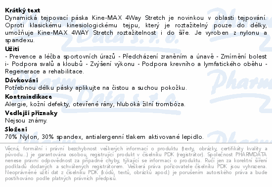 Dynamická tejpovací páska Kine-MAX 4Way Stretch je novinkou v oblasti tejpování. Oproti klasickému kinesiologickému tejpu, který je roztažitelný pouze do délky, umožňuje Kine-MAX 4WAY Stretch roztažitelnost i do šíře. Je vyroben z nylonu a spandexu.
