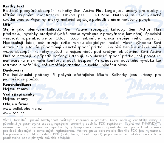 Elastické prodyšné absorpční kalhotky Seni Active Plus Large jsou určeny pro osoby s těžkým stupněm inkontinence. Obvod pasu 100-135cm. Natahují se jako klasické spodní prádlo. Příjemný, měkký materiál zajišťuje pohodlí a ničím nerušený pohyb.