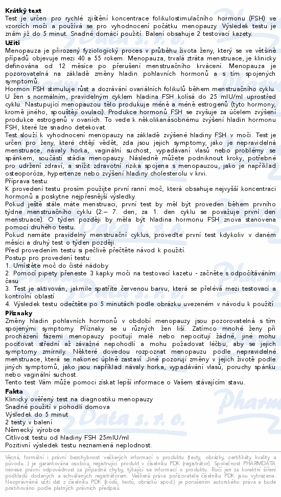 Test je určen pro rychlé zjištění koncentrace folikulostimulačního hormonu (FSH) ve vzorcích moči a používá se pro vyhodnocení počátku menopauzy. Výsledek testu je znám již do 5 minut. Snadné domácí použití. Balení obsahuje 2 testovací kazety.