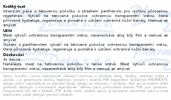 Intenzivní péče o tetovanou pokožku s obsahem panthenolu pro rychlou přirozenou regeneraci. Vytváří na tetované pokožce ochrannou transparentní vrstvu, která přirozeně hydratuje, regeneruje a pomáhá k udržení ochranné kožní bariéry. Nemusí se smývat.