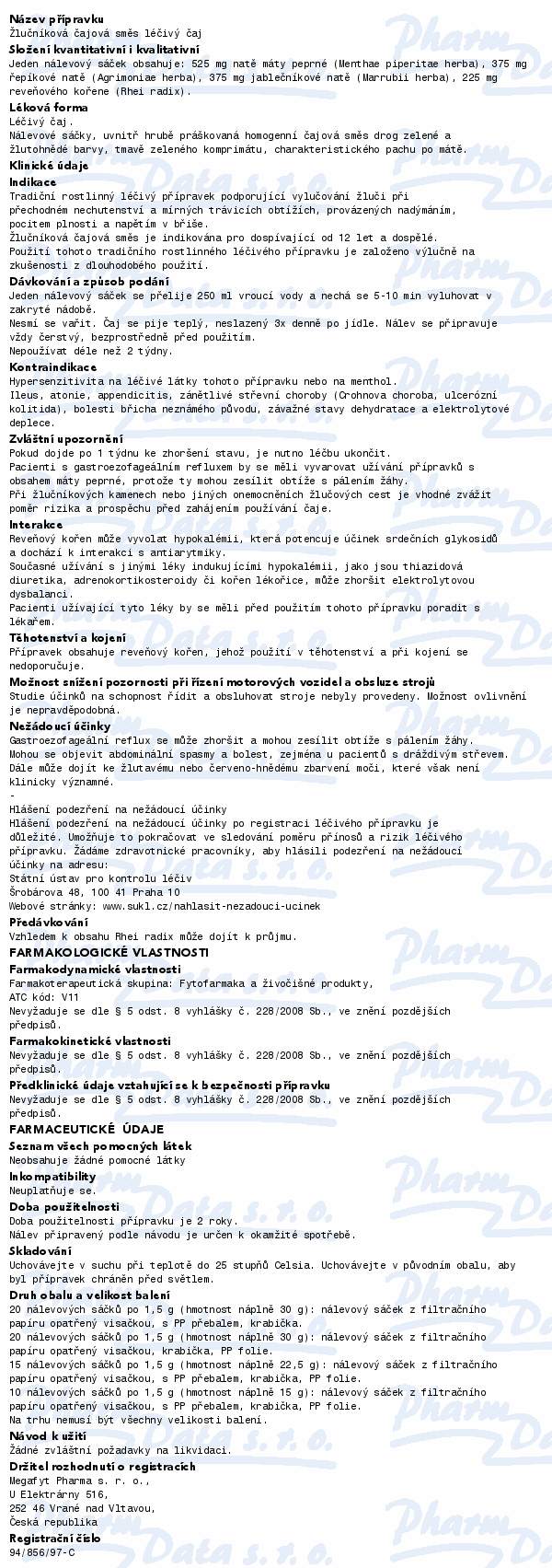 Tradiční rostlinný léčivý přípravek podporující vylučování žluči při přechodném nechutenství a mírných trávicích obtížích, provázených nadýmáním, pocitem plnosti a napětím v břiše. Čtěte pozorně příbalový leták.