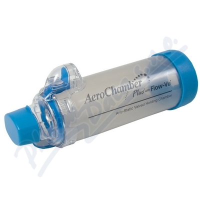 Antistatický inhalační nástavec AeroChamber Plus s ventilem,s indikátorem inspiračního průtoku Flow-Vu, pro inhalační podávání léků (vdechování). Léky se dostávají přímo do dýchacích cest, kde mají velký léčebný účinek a minimální nebo žádné riziko nežád