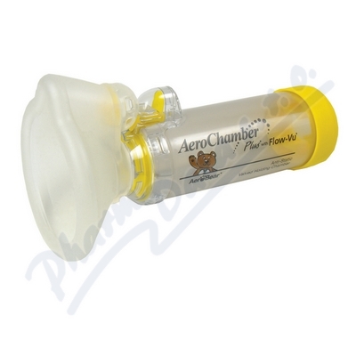Antistatický inhalační nástavec AeroChamber Plus s ventilem,s indikátorem inspiračního průtoku Flow-Vu a maskou pro děti 1 - 5 let, pro inhalační podávání léků (vdechování). Léky se dostávají přímo do dýchacích cest, kde mají velký léčebný účinek a minim