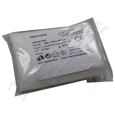 Šátek trojcípý z netkaného textilu, jednotlivě zabalený a proto okamžitě použitelný v předlékařské pomoci i ambulantní péči, při poranění a fixaci především končetin, hlavy apod.