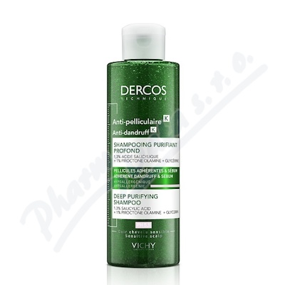 VICHY DERCOS K Šampon proti lupům s peelingovým efektem určený na přilnavé lupy a mastnou vlasovou pokožku. Šampon proti lupům DERCOS K díky jemné exfoliační formuli odstraňuje lupy, mastné přilnavé šupiny a rezidua z vlasové pokožky.