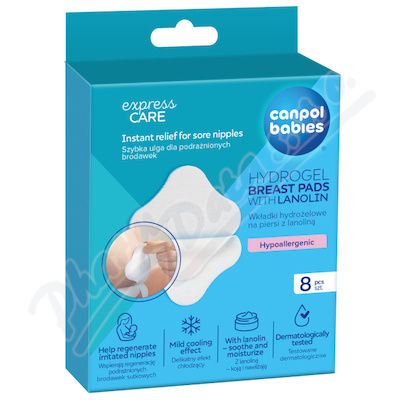 Zklidňující hydrogelové prsní polštářky Canpol babies s lanolinem poskytnou okamžitou úlevu bolavým bradavkám a urychlí hojení. Podporují regeneraci pokožky a zároveň obnovují přirozenou vlhkost tak, abyste mohli pokračovat v kojení. Chladivý účinek.